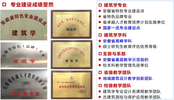 3、我校作为土建类学科为特色的高校,对建筑学专业建设支持力度大。建筑学专业是学校的龙头专业和品牌优势专业,办学历史长教学经验丰富,建筑学专业5次通过住建部专业教育评估,为国家一流专业、省特色(品牌)专业建设点以及安徽省高峰学科。学校对建筑学专业持续加强建设,在教学条件及学科专业建设支持上一直处于校内领先地位。